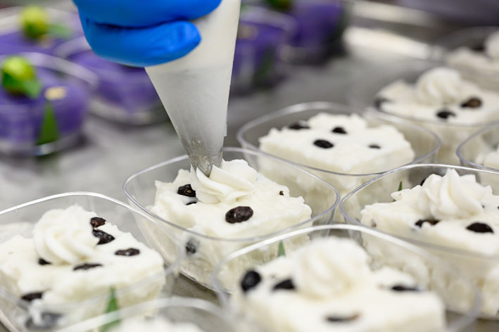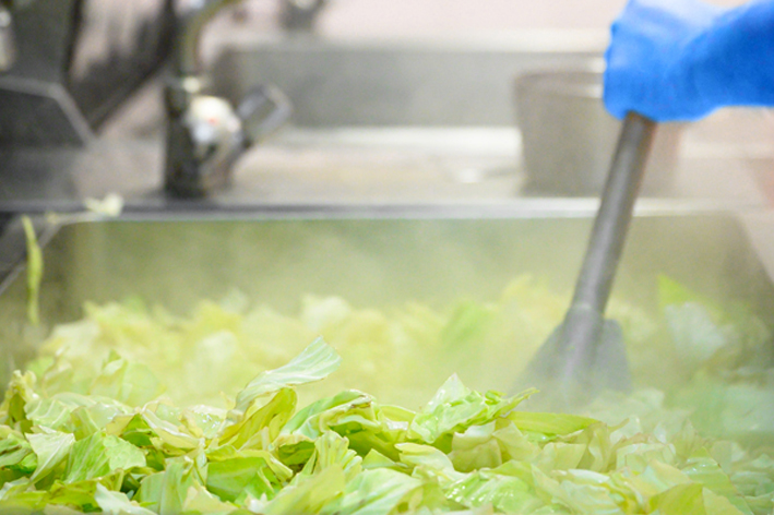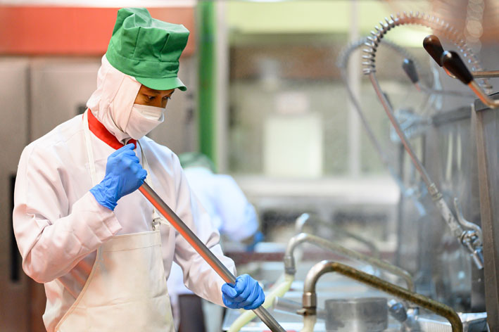 ที่ครัวเย็น เราแบ่งพื้นที่สำหรับการเตรียมอาหารของชั้นหนึ่ง-ชั้นธุรกิจ และชั้นประหยัดแยกจากกัน รวมทั้งมีพื้นที่สำหรับทำแซนด์วิชไว้ต่างหาก เรามีการบันทึกอุณหภูมิและเวลา ตั้งแต่เริ่มปรุงจนถึงส่งมอบตามข้อกำหนด ซึ่งเป็นอุณหภูมิที่ยับยั้งการเจริญเติบโตของจุลินทรีย์ อาหารที่ผลิตจากครัวเย็นของเราจึงยังคงสดใหม่และถูกสุขอนามัยตามมาตรฐานสากล นอกจากนี้ เรายังให้ความสำคัญกับเรื่องรสชาติโดยการสุ่มชิมอาหารเพื่อควบคุมรสชาติให้เป็นไปตามความต้องการของลูกค้า